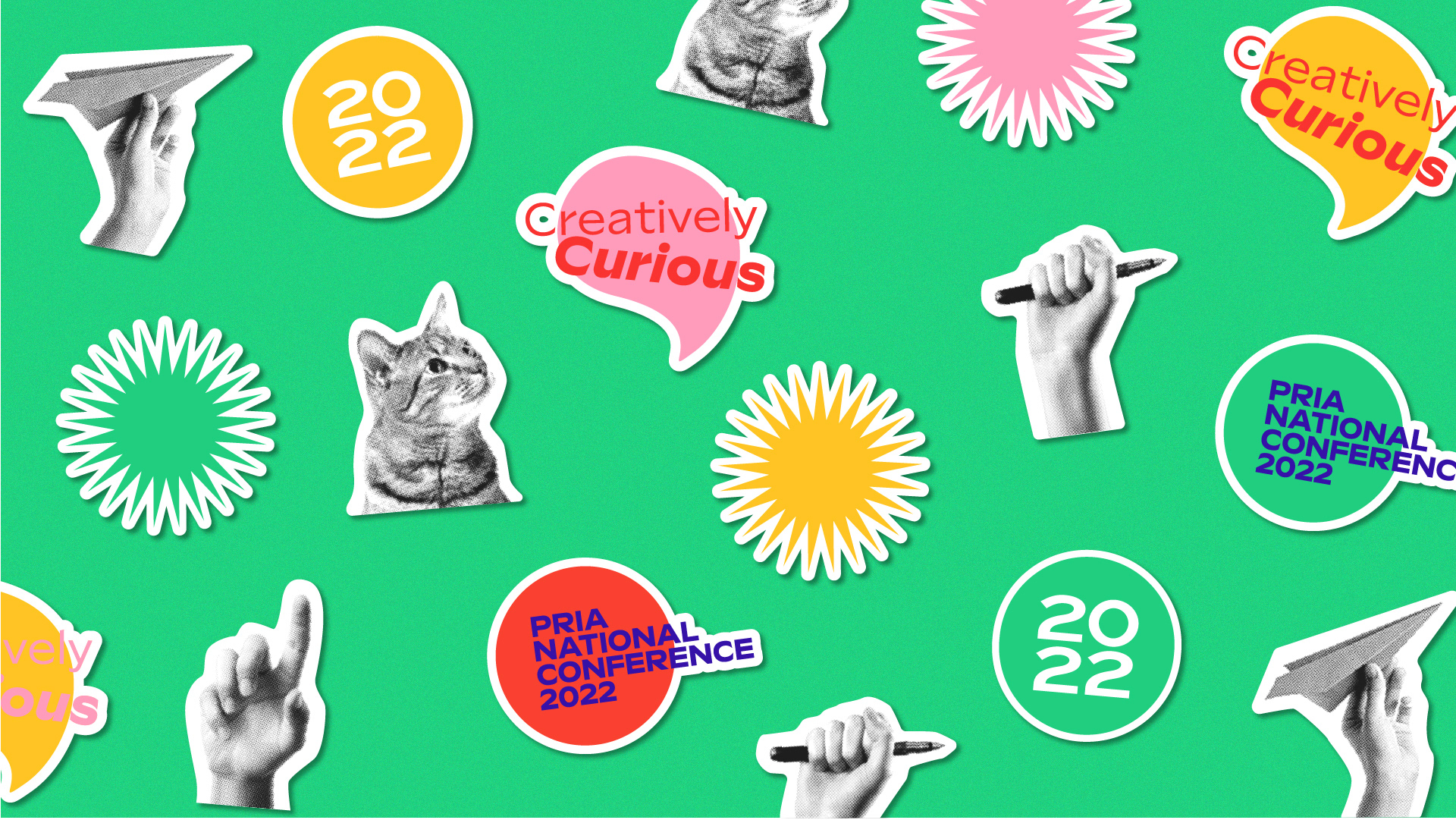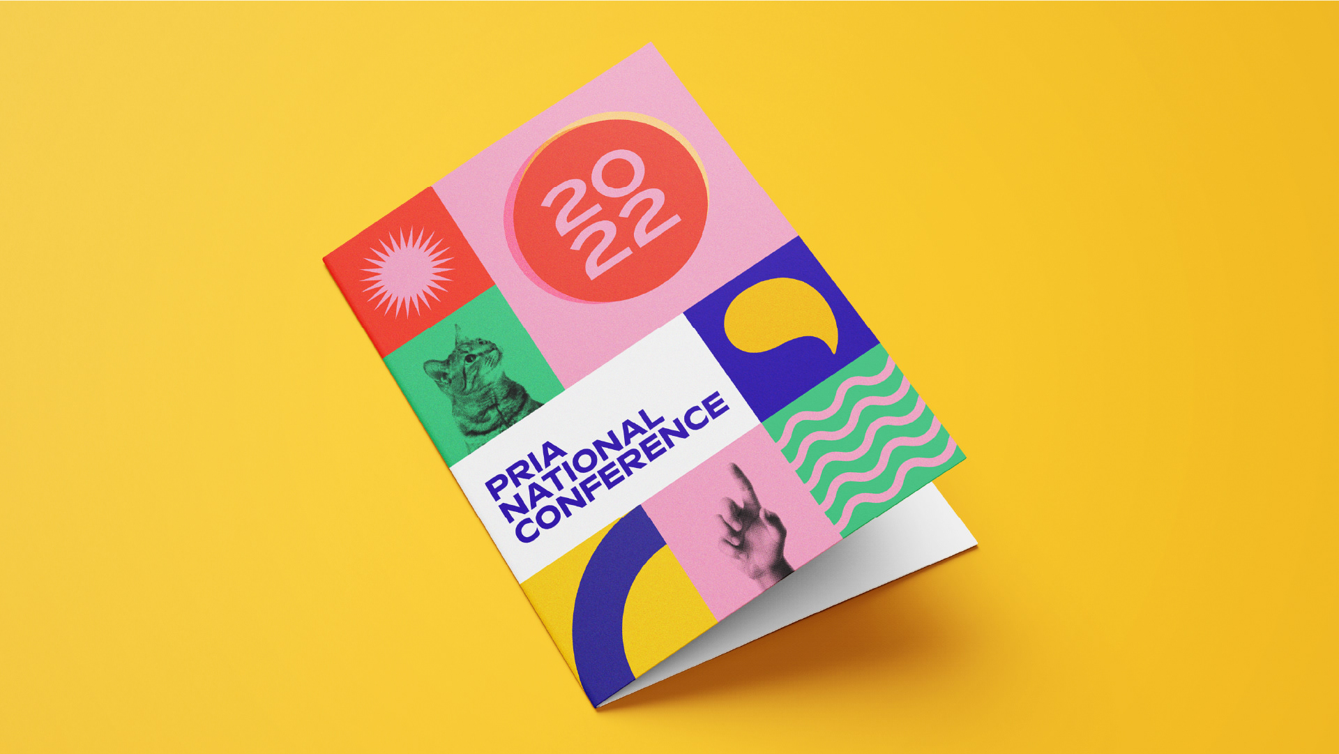When the Public Relations Institute of Australia (PRIA) were planning their annual conference, they knew they wanted an uplifting change from the previous year's COVID-centric theme and challenges. The theme they settled on was "Creatively Curious: A Celebration of Storytellers", so I created an identity featuring bright colours, bold shapes, and a fun 'festival' aesthetic that was unreservedly positive.